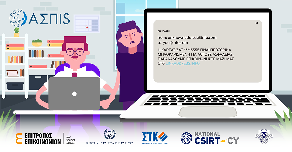 Η Αρχή Ψηφιακής Ασφάλειας, η Αστυνομία Κύπρου (Υποδιεύθυνση Ηλεκτρονικού Εγκλήματος), η Κεντρική Τράπεζα της Κύπρου και ο Σύνδεσμος Τραπεζών Κύπρου ενώνουν δυνάμεις, τεχνογνωσία και εμπειρίες, σε μια κοινή εκστρατεία ενημέρωσης, με στόχο τη δημιουργία ασπίδας προστασίας έναντι των όσων χρησιμοποιούν ηλεκτρονικές μεθόδους με σκοπό την εξαπάτηση πολιτών ή/και οργανισμών.